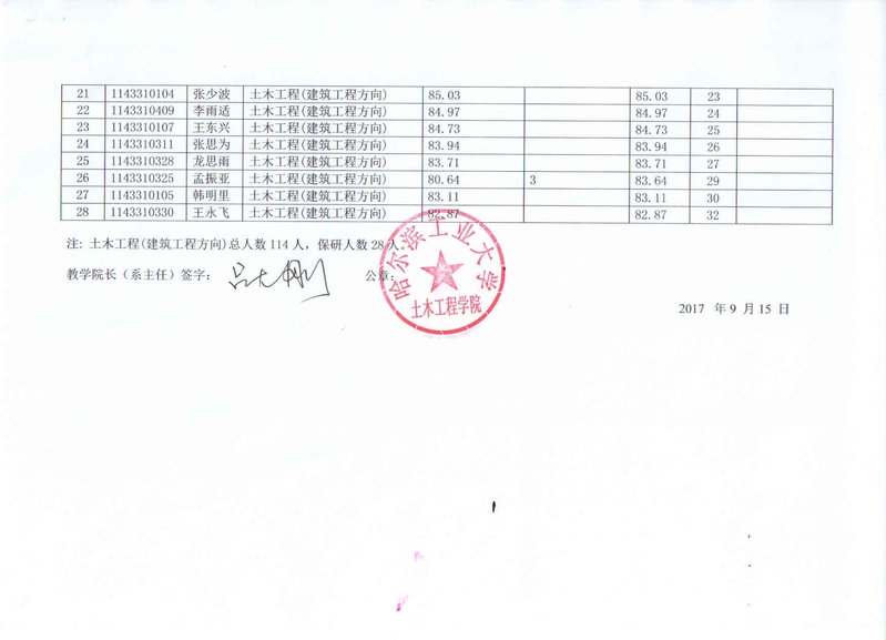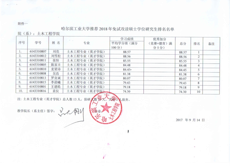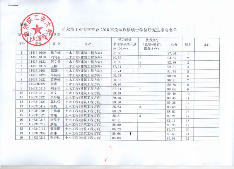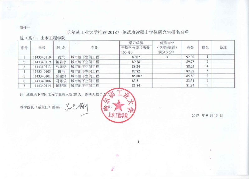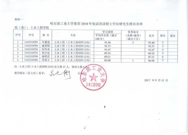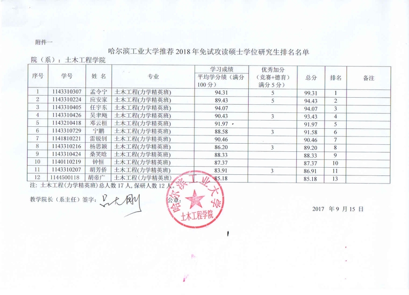 哈尔滨工业大学推荐2018年免试攻读硕士学位研究生排名名单