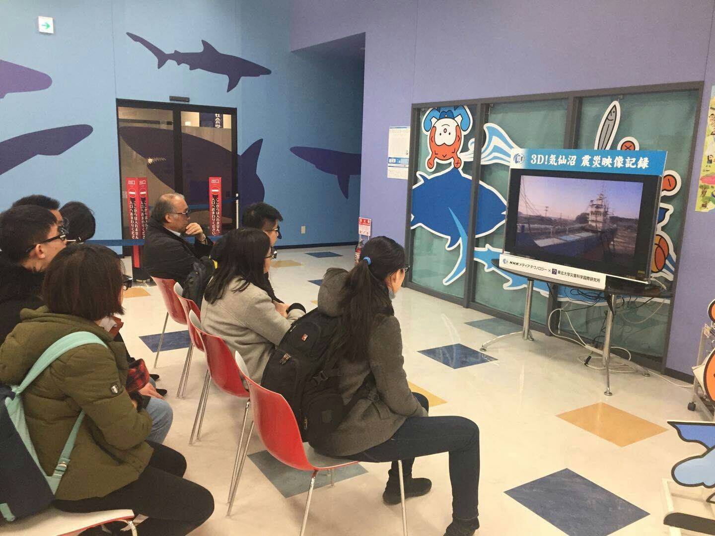 在气仙沼市,交流团来到日本灾害科学国际研究所气仙沼分室,倾听了铃木修技术职员、安倍准教授对气仙沼市受灾情况与灾后重建的报告。植松康教授还带领同学们观看了“311”海啸的影视资料。