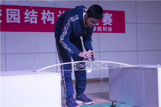 参赛大一学生自由组队,同学们经历了为期13天团队合作的模型设计及制作过程,完成了自己理想的作品。比赛现场,一个个创新独特、结构精巧的作品一一排列开来,静静的等待着加载的考验。加载环节,同学们首先对自己的模型设计进行介绍,而后屏气凝神为自己的模型进行了分级加载。