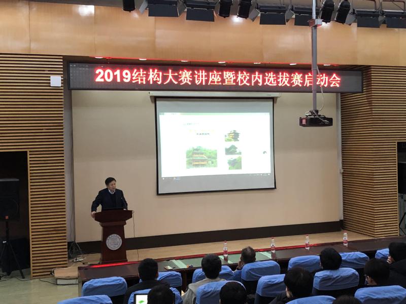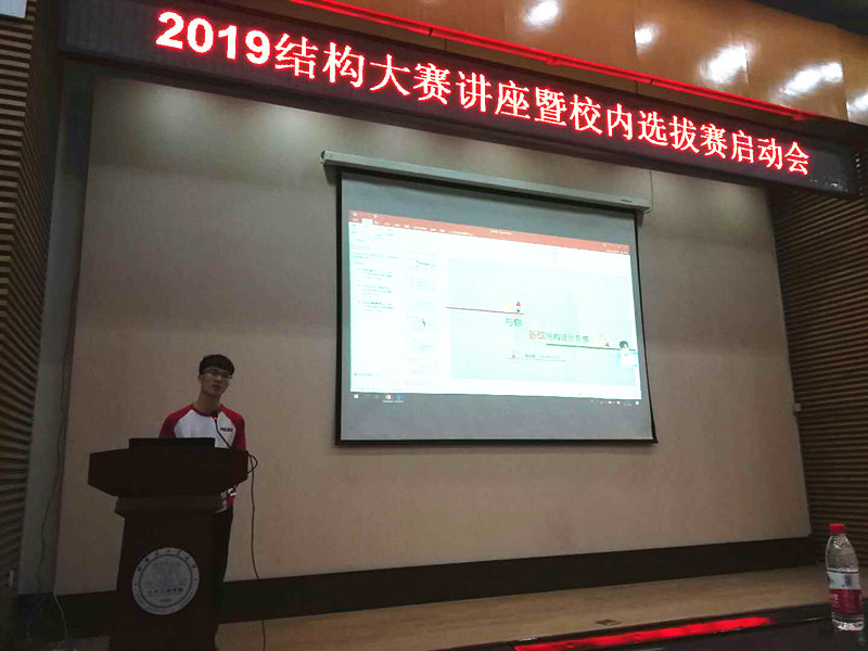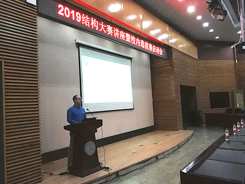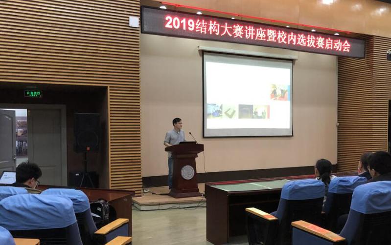 2019年第十三届全国大学生结构设计竞赛知识讲座暨校园选拔赛启动仪式于2019年4月1日在yl6809永利官网报告厅举行。参加本次启动仪式的有本科办副主任赵亚丁老师,结构设计竞赛指导专家邵永松老师,学生科创活动负责人卢姗姗老师以及2016年、2017年两届全国结构设计竞赛一等奖获得者吴进峰同学,2018年全国结构设计竞赛一等奖获得者符洋钰同学。