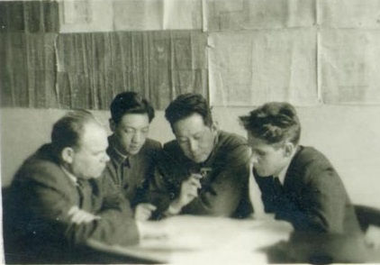系主任李德滋(右二)、副主任陈雨波(右三)与苏联专家研究工作