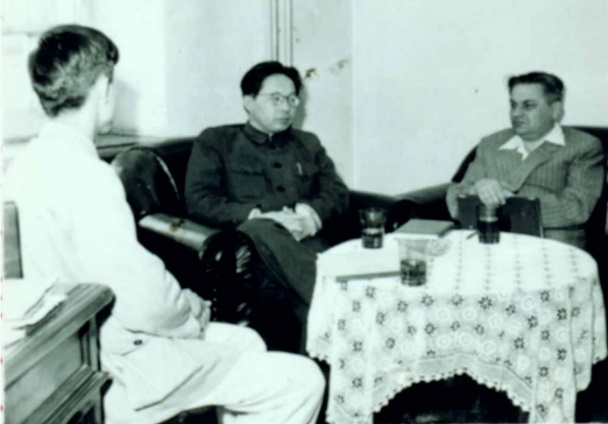 1955年9月李昌校长(中)与苏联专家卡冈(右)、莫叶(左)交谈