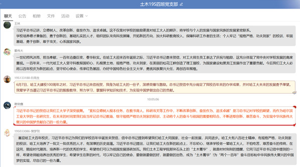 17级本科生党员宋逸伦说,回首工大的历史,新中国成立初期,哈工大扎根东北,爱国奉献,艰苦创业,伴随着祖国的建设发展而成长;进入新时代,哈工大牢记习近平总书记嘱托,充分发挥科技优势、人才优势,为国民经济发展贡献了一大批高技术成果。感知百年厚重历史,感悟百年初心使命。一百载春华秋实,桃李飘香。作为一名哈工大土木人,应秉承“百年土木,百年树人,励精图治,厚积薄发”的精神,在新百年中,延续爱国奋斗传统,为实现“两个一百年”奋斗目标和中华民族伟大复兴的中国梦作出新的更大贡献。
