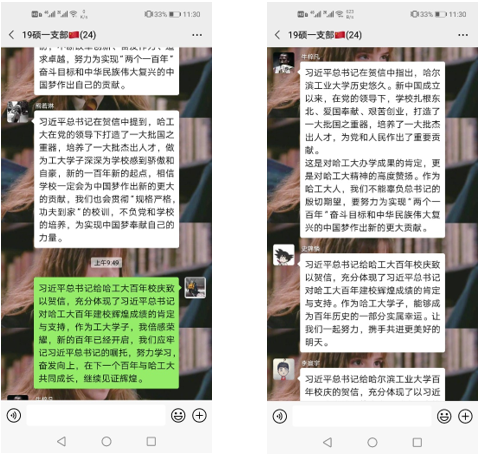 18级硕士生杨思颖说,母校收到习近平总书记的百年贺信,我感到非常自豪,是工大的前辈们的百年奋斗,老师潜心育人;学子踏上社会后,在平凡或不平凡的岗位上艰苦奋斗,前辈们齐心为国家发展做出了自己的贡献,才有了工大的有口皆碑。作为一名哈工大在校的研究生,感谢学校提供的广阔平台,感恩前辈们的不懈奋斗,我要更努力学习,做一名合格的哈工大人,为母校再创新百年辉煌贡献力量。