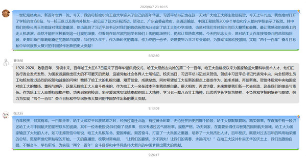 17级本科生党员党奔彪说,在这个特殊的时期,虽然未能到百年校庆活动的现场,但内心的自豪和触动丝毫未减。一世纪规格功夫,新百年世界一流,哈工大建校一百年以来,扎根东北边疆,以爱国奉献为核心,立足航天,服务国防,时时刻刻以国家建设需求为主,为我国繁荣富强做出了不可磨灭的贡献。习近平总书记的贺信,是党中央对我校百年功绩的肯定,也是对我校未来发展的激励。作为哈工大的一员,我们当牢记习近平总书记和党中央的嘱托,不忘初心,牢记使命,为中华民族伟大复兴的中国梦不懈奋斗。