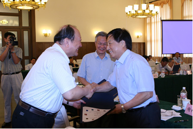 中国工程院徐匡迪院长向谢礼立(右一)颁发中国工程院主席团成员证书