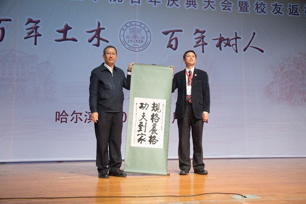 母校百年华诞之际,北京建筑大学校长张爱林校友特邀中国书法家协会会员、当代中国传统书法传承人启骧创作了校训“规格严格,功夫到家”的书法作品并以北京建筑大学的名义赠送给哈尔滨工业大学,大会上张爱林校友代表北京建筑大学向母校赠送,校长周玉院士代表学校接受礼物。