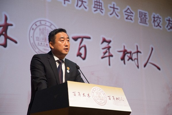 24日上午,“百年土木 百年树人”百年庆典大会暨校友返校见面会在二校区文体中心114礼堂隆重召开,校长周玉出席大会并讲话,中国工程院院士沈世钊、哈尔滨工业大学原副校长孙和义和景瑞、校长助理范峰出席大会,大会由土木工程党委书记乔世军主持,学校领导、嘉宾、校友以及学院师生近**参加大会。