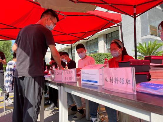 八点开始,研究生萌新们迈着笃定的步伐,怀揣饱满的热情,在指示牌和志愿者的引领下,错峰且有序地提交材料完成报道手续,领取学院精心准备的专属领带和纪念徽章,辅导员老师和志愿者同学们耐心细致的提醒、一句句“学业有成”的祝福,褪去了大家初来乍到的紧张和羞涩。提前准备的照相立牌、手持标语也为迎新工作增添了色彩,萌新们争相并在学院楼前、菁华石旁合影留念。