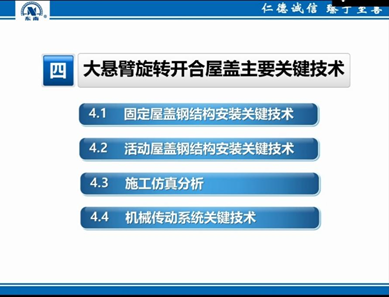 周观海对杭州奥体网球中心项目条件和结构进行分析,指出了施工中可能存在的结构造型复杂、施工难度大、结构变形控制难度大、测量要求高,难度大、临时支撑设计与卸载要求高、活动屋盖底面调试要求高、活动屋盖整体吊装难度大、传统系统自适应要求高、屋面防水、抗风设计难度大等八个主要问题,并针对于此讲解、分析了固定屋盖钢结构安装关键技术、活动屋盖钢结构安装关键技术、施工仿真分析、机械传动系统关键技术等四项大悬臂旋转开合屋盖主要关键技术。