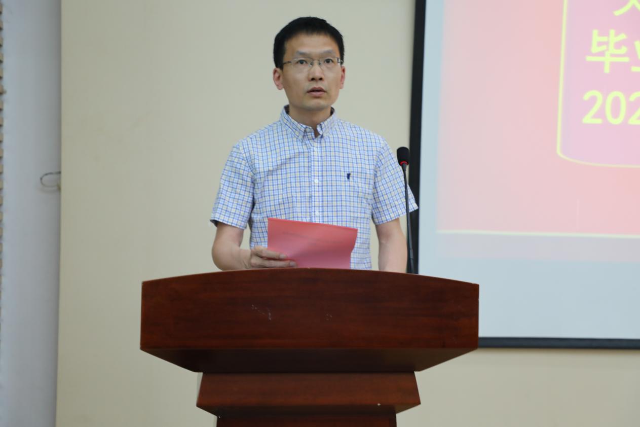 教师代表李良宝在寄语毕业生环节回顾了自己给同学们上课时的感受与回忆,表达了对同学们的不舍,他希望同学们在人生道路上面对困难和挫折不要“躺平”“佛系”,要保持终身学习的习惯和终身奋斗的劲头,他祝福同学们学业有成、未来可期,早日成为祖国栋梁之才。